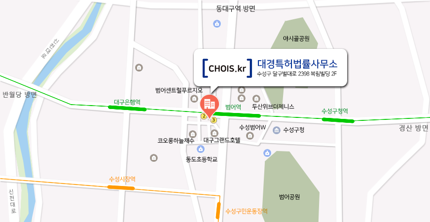 찾아 오시는길 Contact Us 대경특허법률사무소 주 소 : (42117) 대구광역시 수성구 달구벌대로 2398 복림빌딩 2F 전 화 : 053-627-9797 팩 스 : 053-257-2691 ※ 지하철 2호선 범어역 2번,3번출구앞 ※ 범어4거리 그랜드호텔 > 지구대우측 > SKT대리점 옆 > 복림빌딩 2층 지도보기 이미지맵 구글맵 주차안내